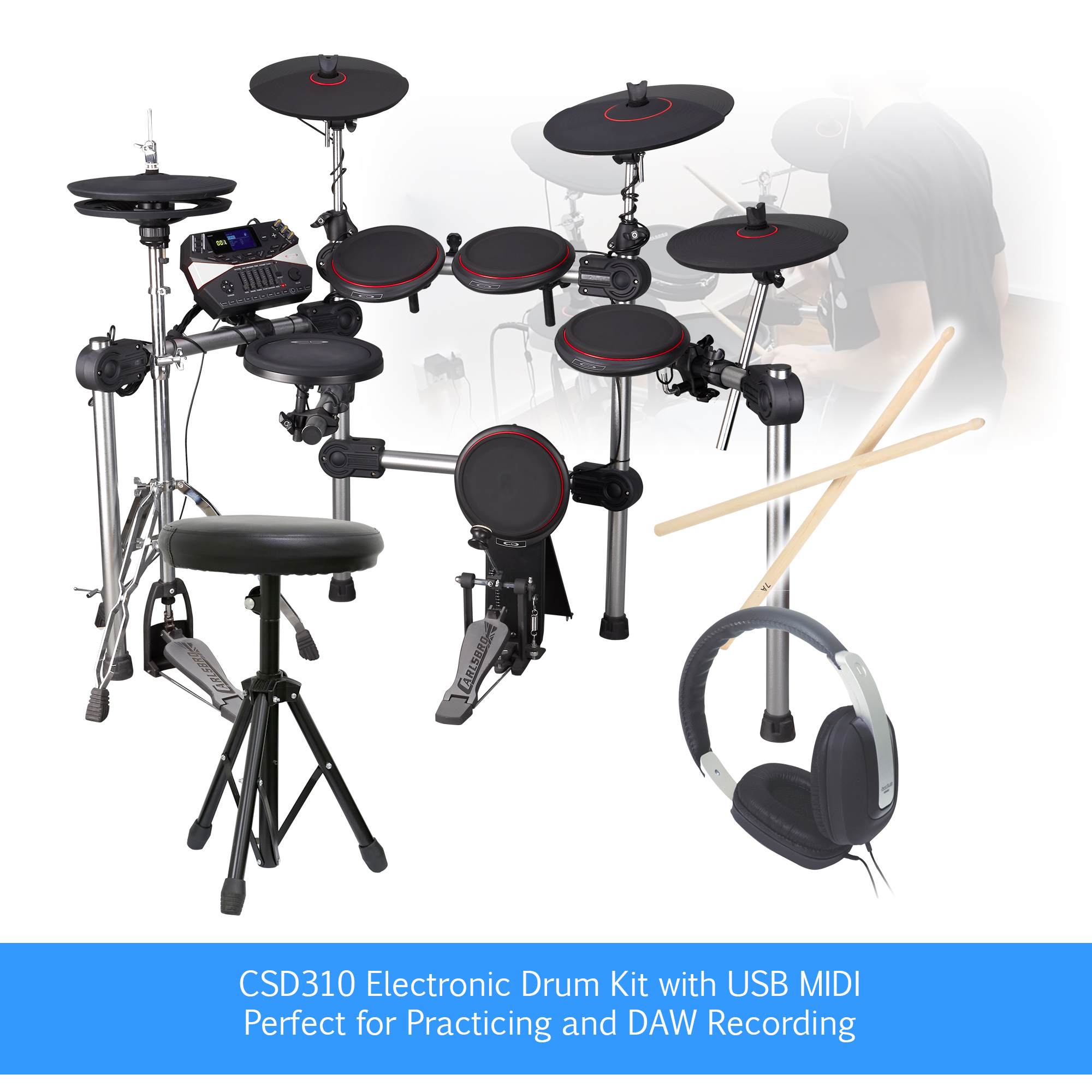 Carlsbro Csd100 R Plus Electronic Drum Kit 7 Piece Digital Set Stool Headphones Drum Sheet Music Notation Guide